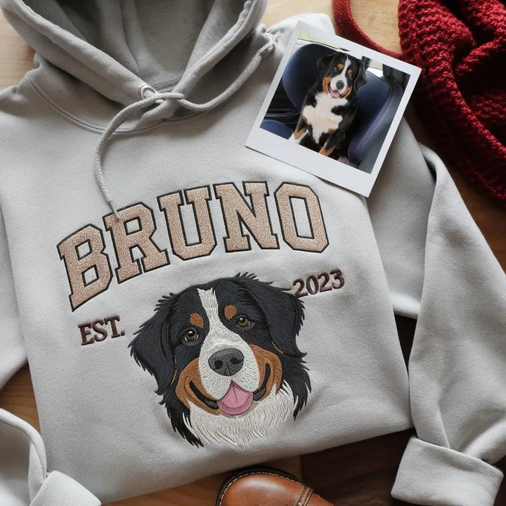 Our Custom Full-Color Pet Portrait Embroidered Sweatshirt transforms your favorite photo into a vibrant, detailed embroidery — capturing every expression, shade, and whisker.