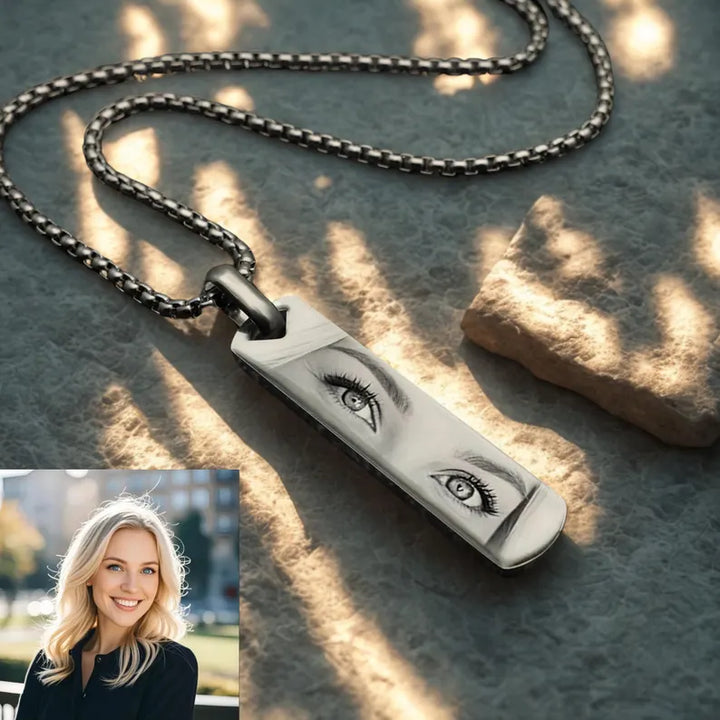 Our Custom Engraved Eyes Necklace is a deeply personal piece of jewelry, uniquely crafted using a photo of your loved one’s eyes. Whether it's your partner, child, parent, best friend, or even a beloved pet, this necklace captures the emotion, connection, and memory you hold dear.