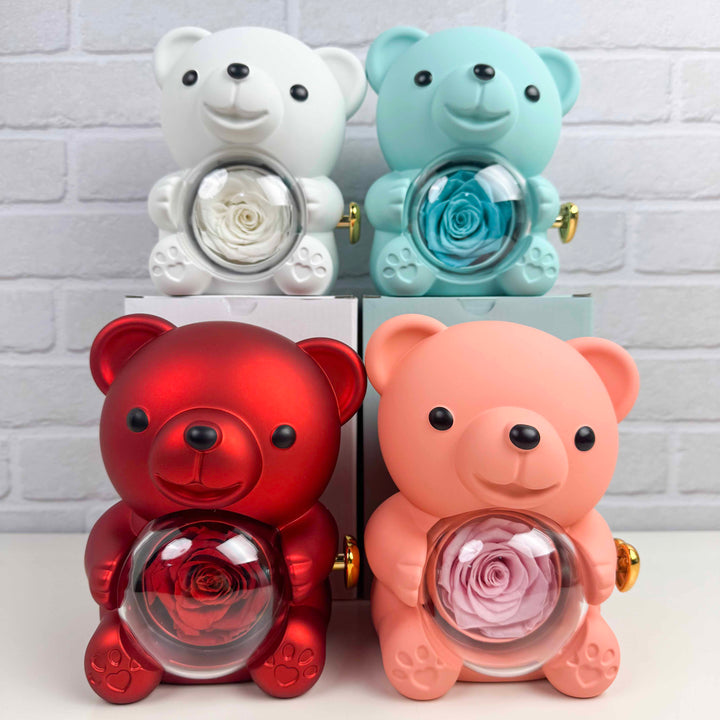 This stunning Eternal Rose Bear is handcrafted from real preserved roses. Each rose has been carefully dried and treated to keep its natural beauty, softness, and vibrant color for years to come.
